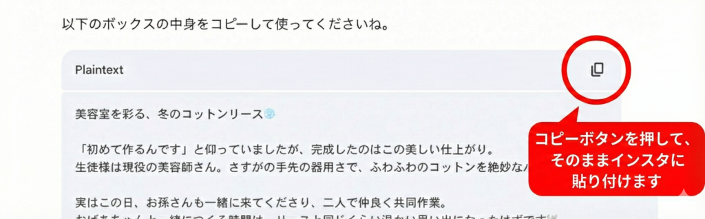 完成した文章は、「コピー専用のボックス(コードブロック)」に入った状態で届きます。