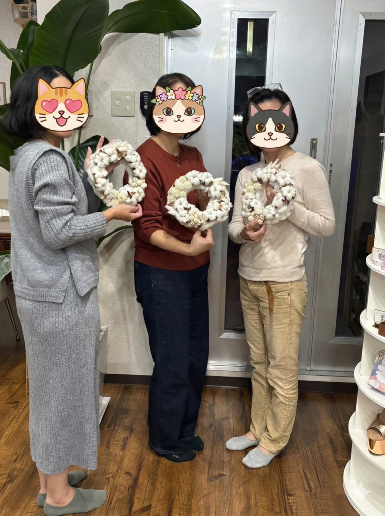 ご参加くださった3名の皆さま、そして素敵な場所を提供してくださったWellness Salon Crown様、本当にありがとうございました。 ご自宅で、ふわふわの白いリースに癒やされる冬をお過ごしくださいね。