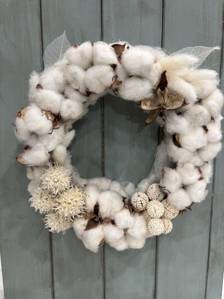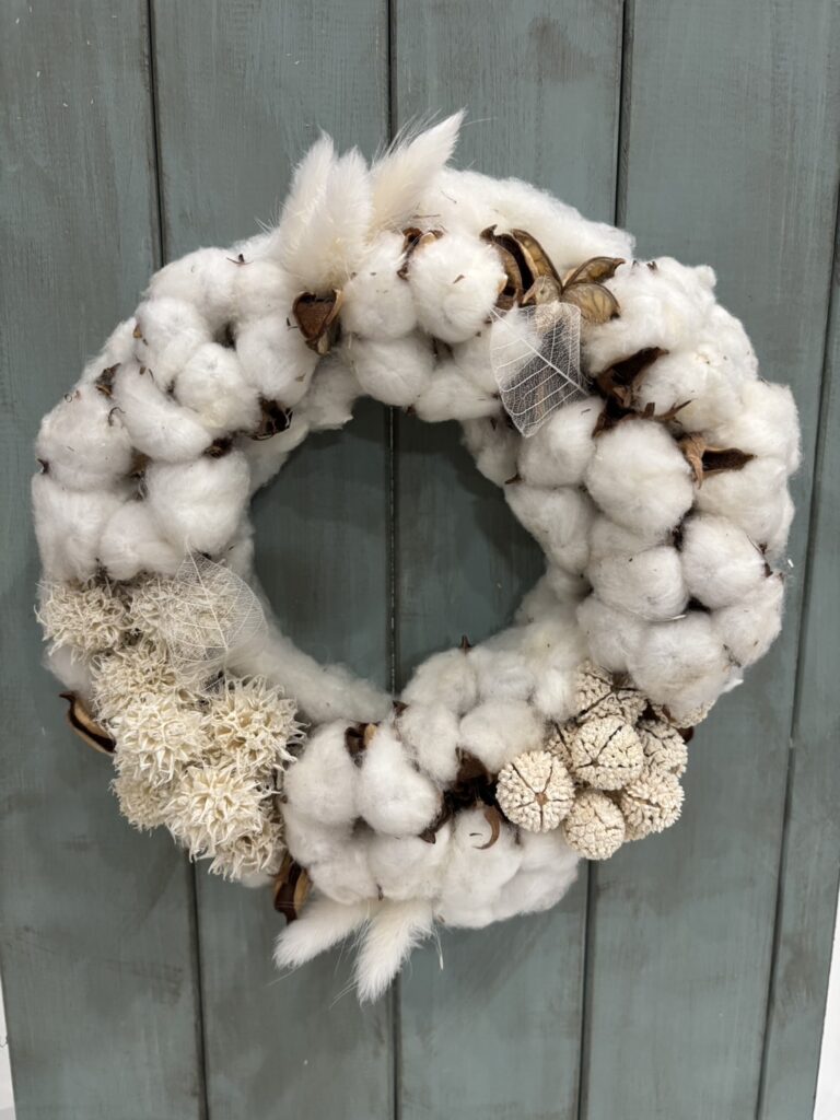 今回の主役は、まるで降り積もった雪のようなコットン(綿花)。 そこへ、透け感が美しいスケルトンリーフや、ふんわりとしたラグラス(ウサギのしっぽ)など、様々な質感の白い花材をプラスしていただきました。