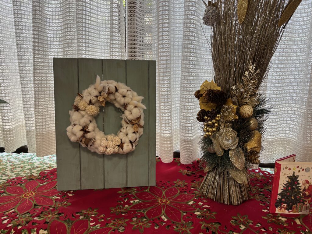 深紅のポインセチア柄のクロスに、煌びやかなゴールドのアレンジメント。 そんな華やかなクリスマスムードの中に、シャビーシックなボードに飾られたコットンリースが、ふんわりとした優しい静けさを添えています。